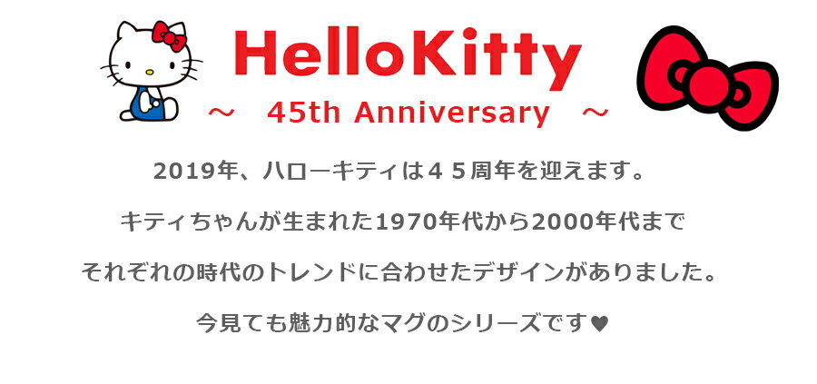 キティちゃん 45周年 マグカップ いろいろな年代に合わせたキティちゃんのマグカップがそろいました! お友達やご家族へのプレゼントやギフトにいかがでしょうか。